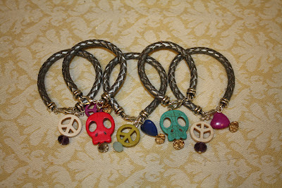 Pulseras de cordón seda y cadena dorada. Charm corazón, paz, calaveras. |